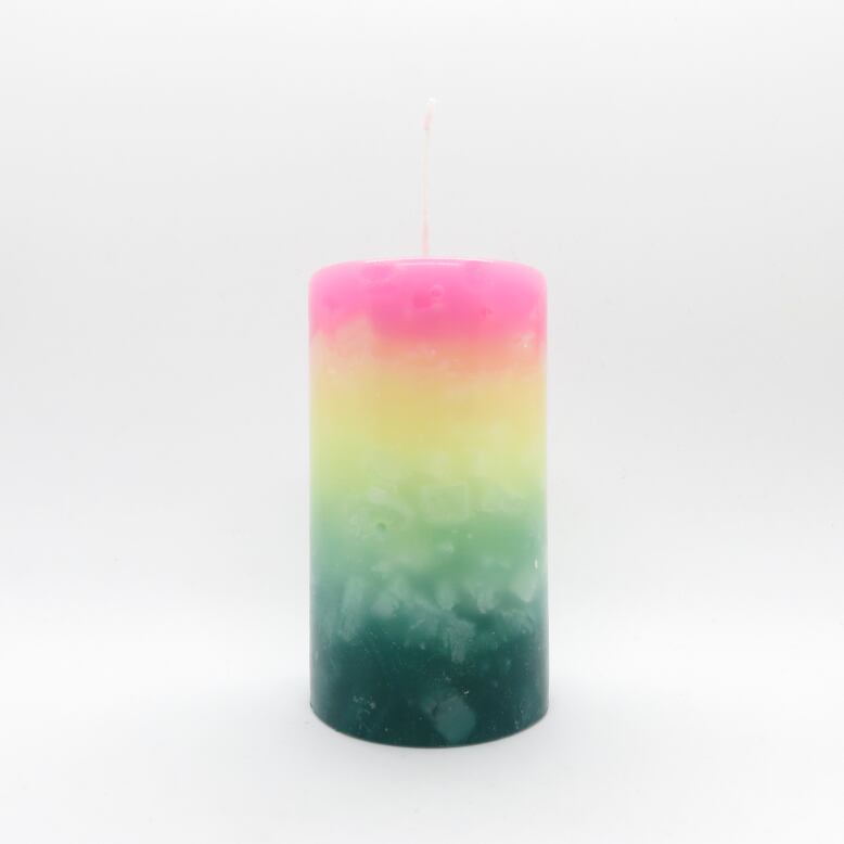 明るい赤紫色のマロウ、淡い黄色のクリームイエロー、濃い青みの緑のビリヤードグリーンのグラデーションキャンドルです。