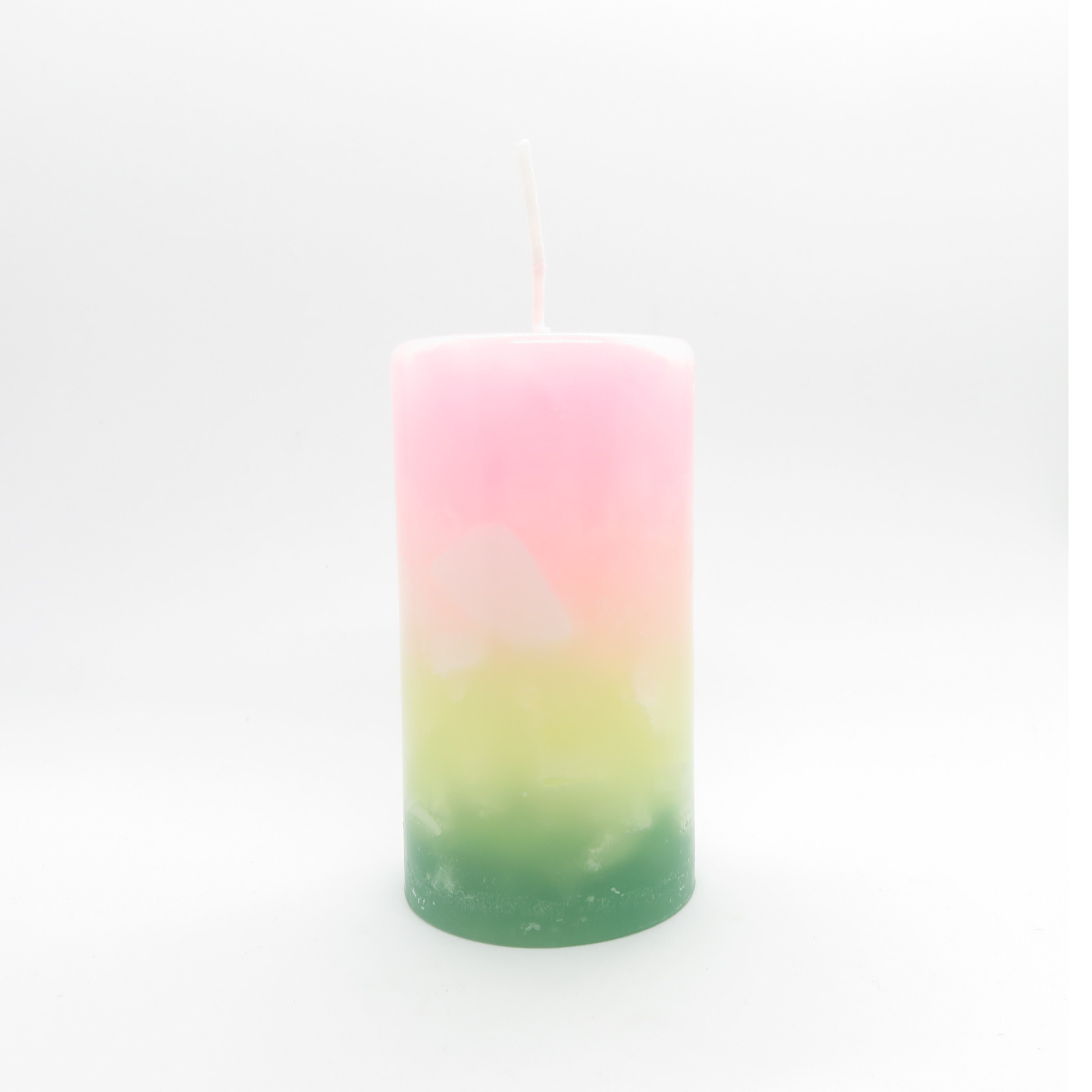 蛍光ピンク、レモンいろ、灰色がかった緑のヴェルディグリのグラデーションキャンドルです。