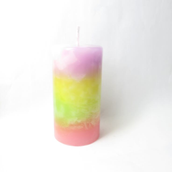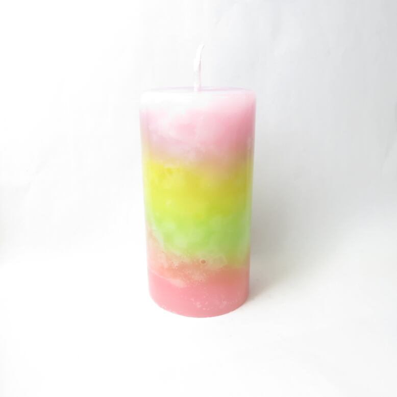 上から優しいピンクと紫、元気になるイエローとライム、温かみを感じるオレンジとコーラルのカラフルなキャンドルです。